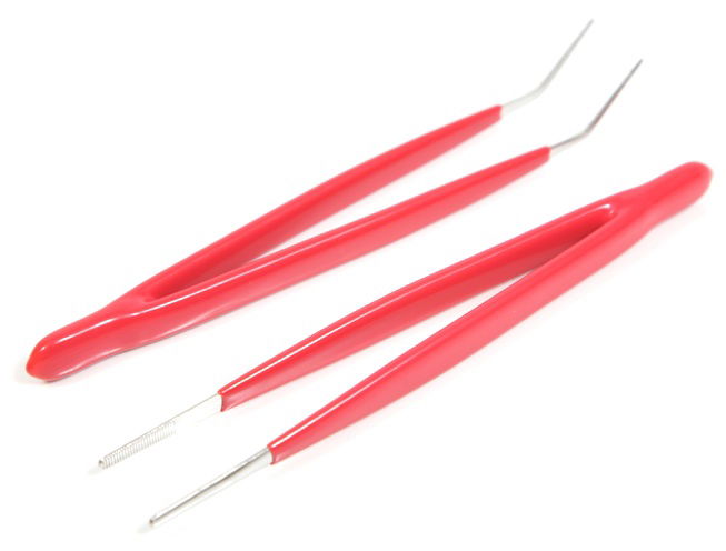 2 db (1 db egyenes, 1 db 45 fokban hajlított végű kivitel) 150 mm hosszú műszerészcsipesz, recés fogófelület, gumírozott nyél.